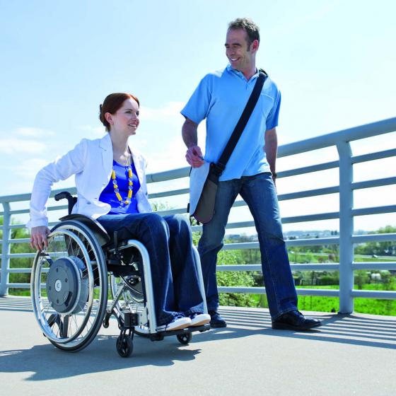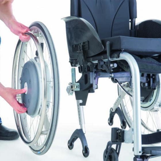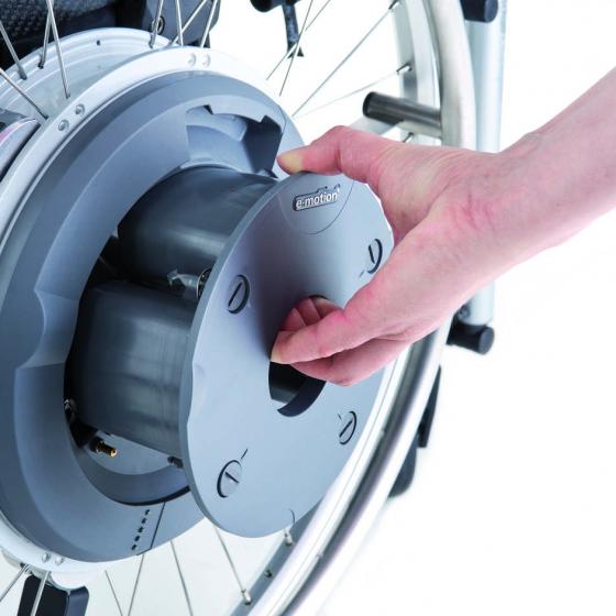 The E-motion manual wheelchair add on merges active mobility with therapeutic benefit with its power assist wheels that provide easy motion in just one push. It's ideal for those with impaired strength and helps people pushing a wheelchair as the power assist wheels require little effort. It features a modern drive concept based on a powerful electric motor inside the wheel hubs. E-motion will fit almost every standard manual wheelchair and it is easy to dismantle for transportation.