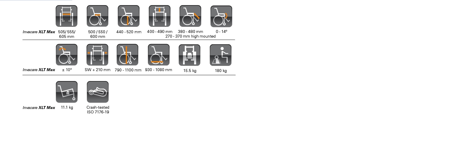 Stability, Rigidity, Security: Be Active! The Invacare XLT Max is a bariatric, rigid active wheelchair ideal for day-to-day use. Built with a titanium frame, it is designed to support a weight up to 180 kg with seat width possibilities of up to 60 cm. The Max offers various levels of support enabling greater mobility and a more active lifestyle.
