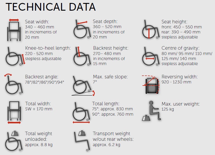 Configurable and adjustable like no other wheelchair, the küschall Advance® has been designed to be customised and adjusted easily to a range of individual needs. A wheelchair with stepless adjustability, with an accuracy to the mm on: rear seat-to-floor height, front seat-to-floor height, centre of gravity, knee-to-heel length and brake position. A sprung carbon seat plate offers a unique pressure relief solution.