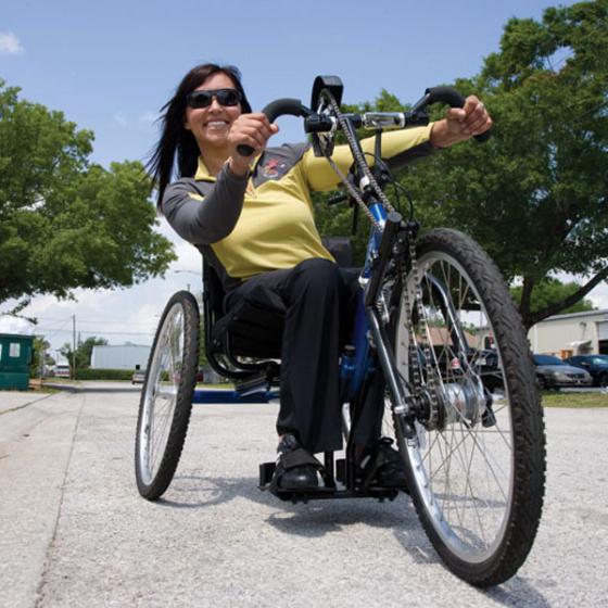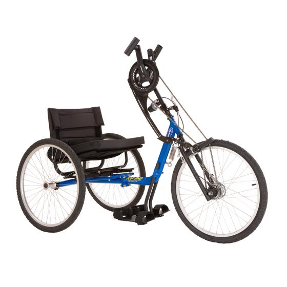 If you want a great way to exercise, cross-train or just have fun, one of the Invacare® Top End® Excelerator™ Series Handcycles is just what you need. This upright and extremely manoeuvrable three wheel hand cycle is capable of speeds up to 15 mph. The smooth 7 speed Shimano hub with its reversing drum brake delivers hands on braking and allows the rider to tackle hills and level terrain with equal ease.