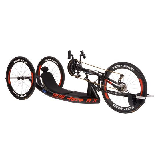 The Invacare® Top End® Force™ RX Handcycle with adjustable carbon fibre back combines speed with adjustability in a lightweight aerodynamic package. The 7005 aluminium heat treated frame is fabricated with one piece side frames, plus there are multiple enhancements to allow a more reclined position without interference. The custom reclined frame with adjustable feather weight carbon fibre back is ultra light and sturdy.
