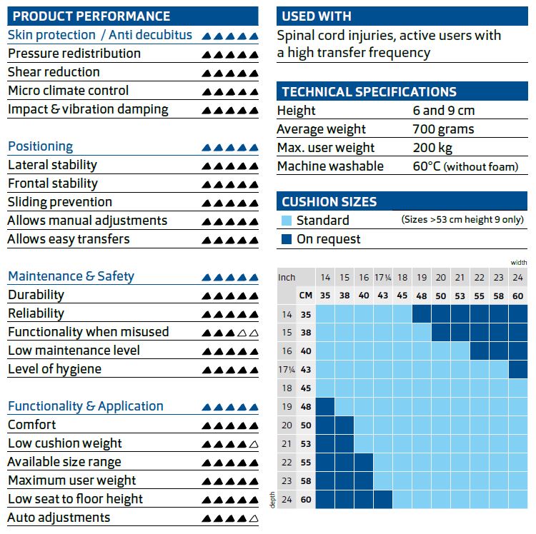 Based on the original Vicair Active product, this machine-washable and breathable wheelchair cushion is designed for active individuals who transfer frequently. It features a firm foam front which provides a stable platform for easy transfers combined with Vicair Smartcells at the rear for optimal skin protection around the ischial tuberosities and coccyx area. The Vicair Active O2 wheelchair cushion also offers an easily accessible storage pouch for precious belongings such as keys, phone and wallet.